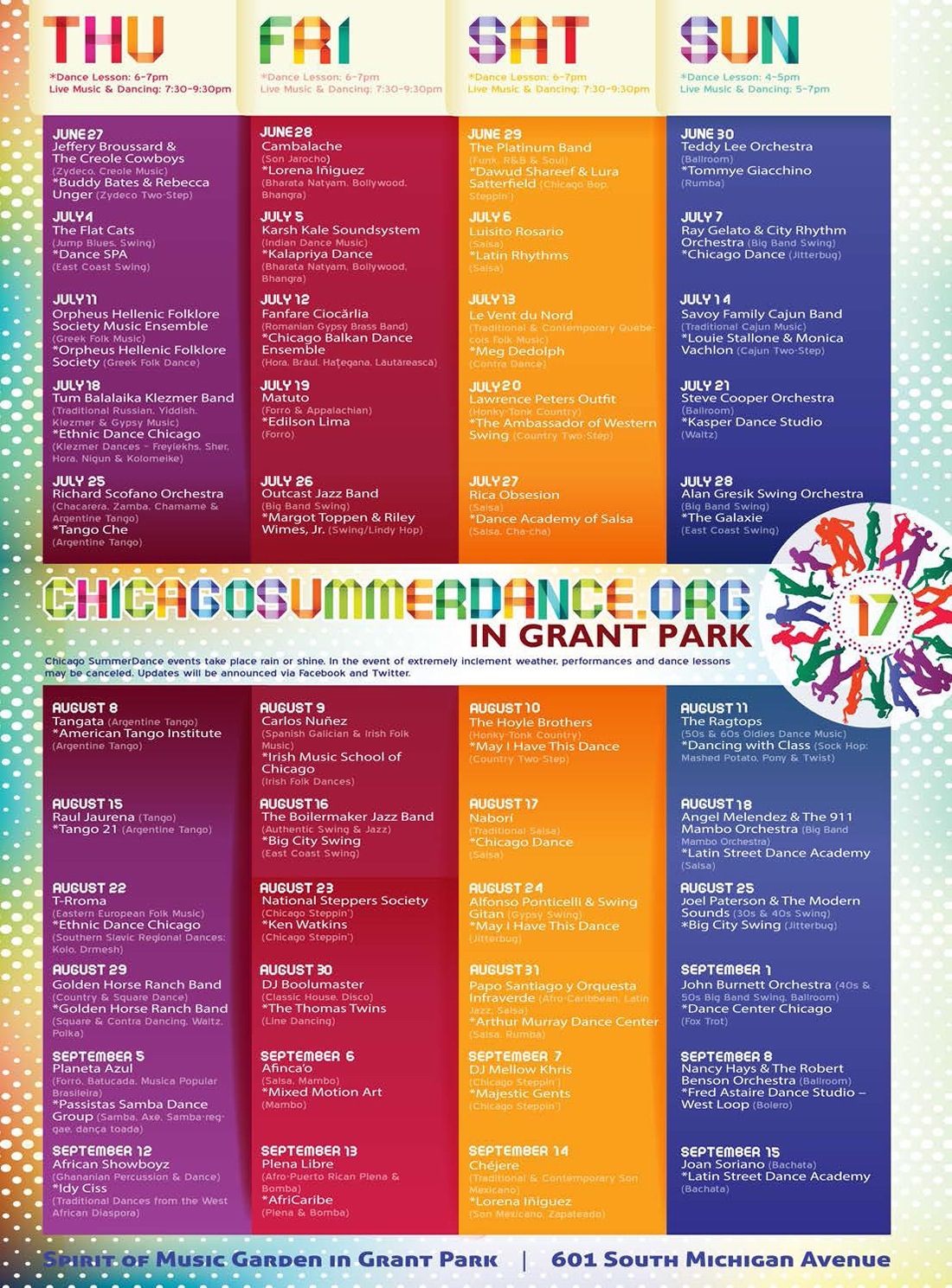 Chicago SummerDance Fest is my favorite festival and the largest annual outdoor dancing series in the United States. Dance to the sounds of 44 different live bands and get into step with dance lessons beforehand. Glide across the restored 4,900-square-foot, 100 percent recycled, open-air dance floor designed by Chicago artist Dan Peterman. This a great public space that congregates a very diverse crowd: you will see people from different ethnicities, backgrounds, and ages getting together to dance with music from around the world, and all for free! My recommendation: Mark your calendar for Romanian Gypsy brass band Fanfare Ciorcalia concert on July 12. Below is the complete calendar for this season: