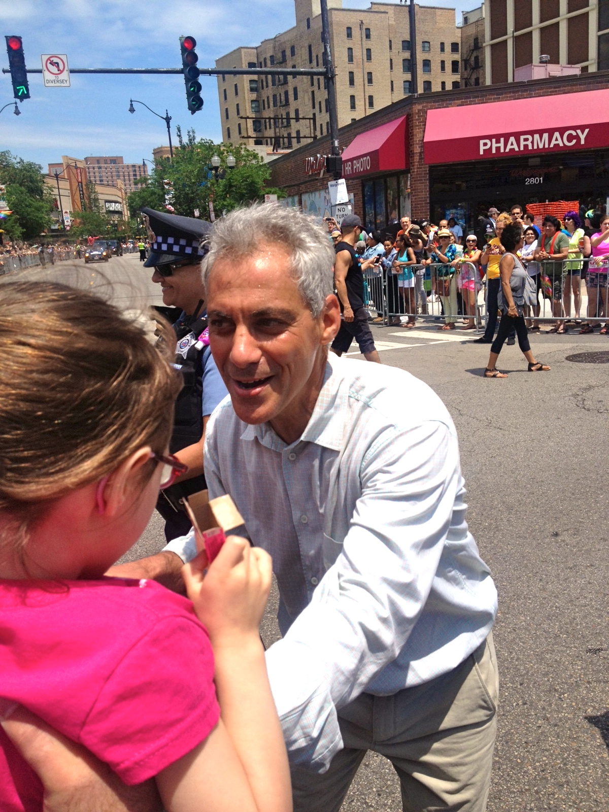 Mayor of Chicago Rahm Emanuel shaking hands at the 2013 Chicago Pride Parade. Photo credit: Paola Tumy